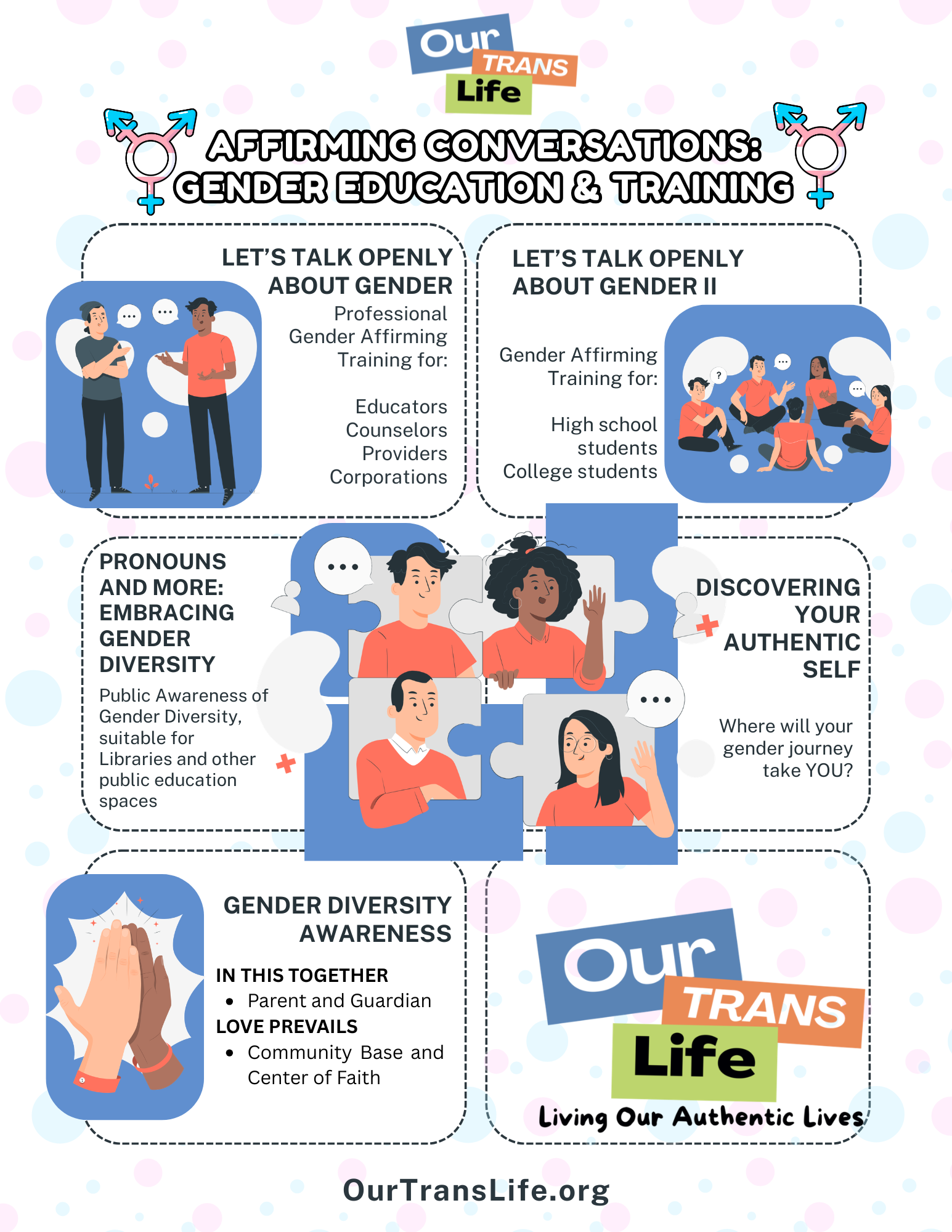 Affirming Conversations advances OurTransLife’s (OTL) mission by fostering inclusive and authentic community dialogue around gender diversity. The program encourages participants to reflect on their own understanding of gender and to engage in respectful, informed conversations that promote a culture of authenticity and inclusivity in their schools, workplaces, and communities. Through tailored, interactive workshops, participants build capacity for gender-affirming practices and leave with practical tools and increased confidence to support trans and gender-diverse individuals in both personal and professional settings.