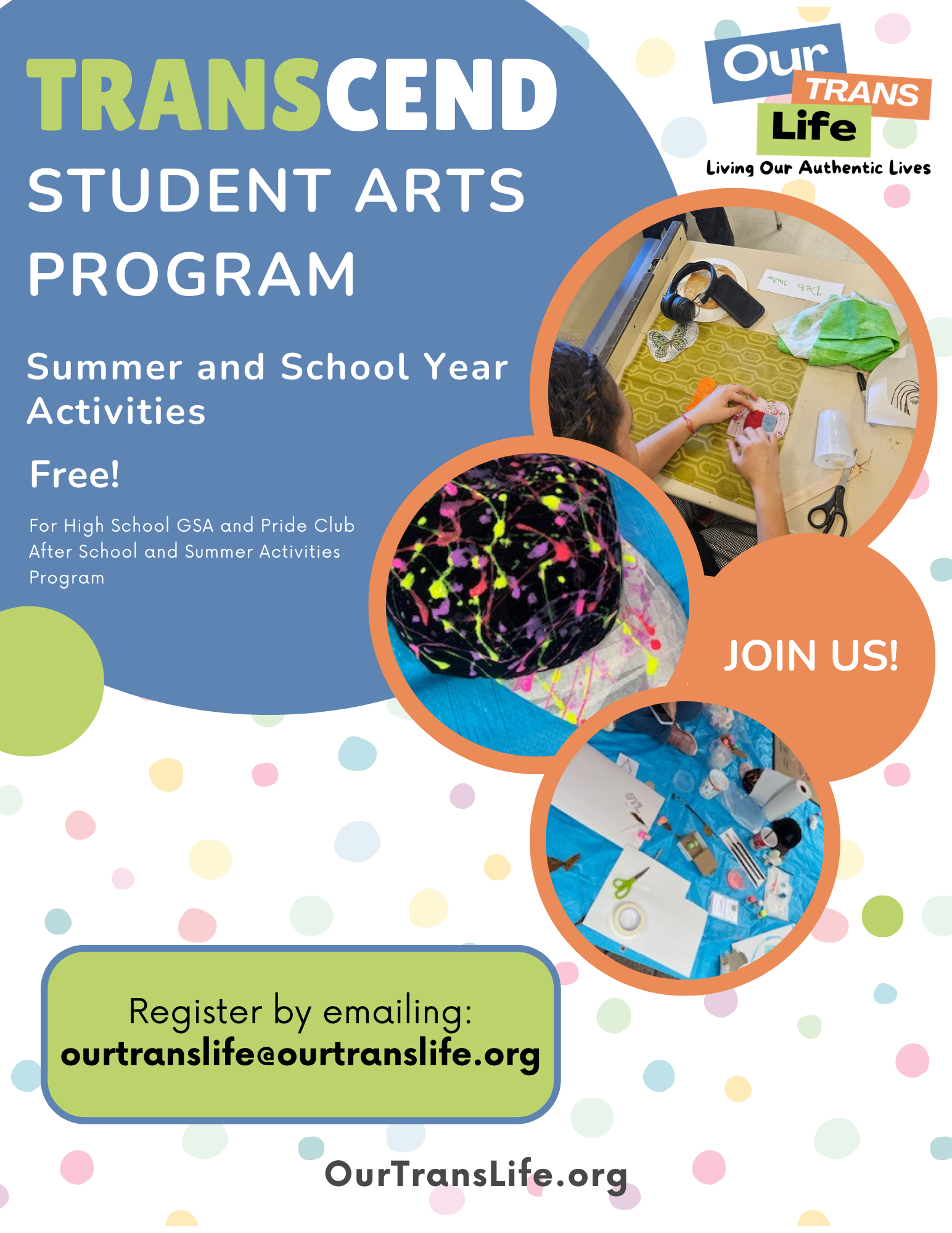 TRANScend is a gender identity-focused art based workshop series designed to support middle and high school. During the school year, we run programs in the schools, and in the summer, we seek to promote the maintenance of queer connection through one-off programs about every two weeks. This program specifically engages transgender, gender-diverse, and LGBTQ+ youth while welcoming allies, creating a safe and inclusive space for self-expression, identity exploration, and peer fellowship.